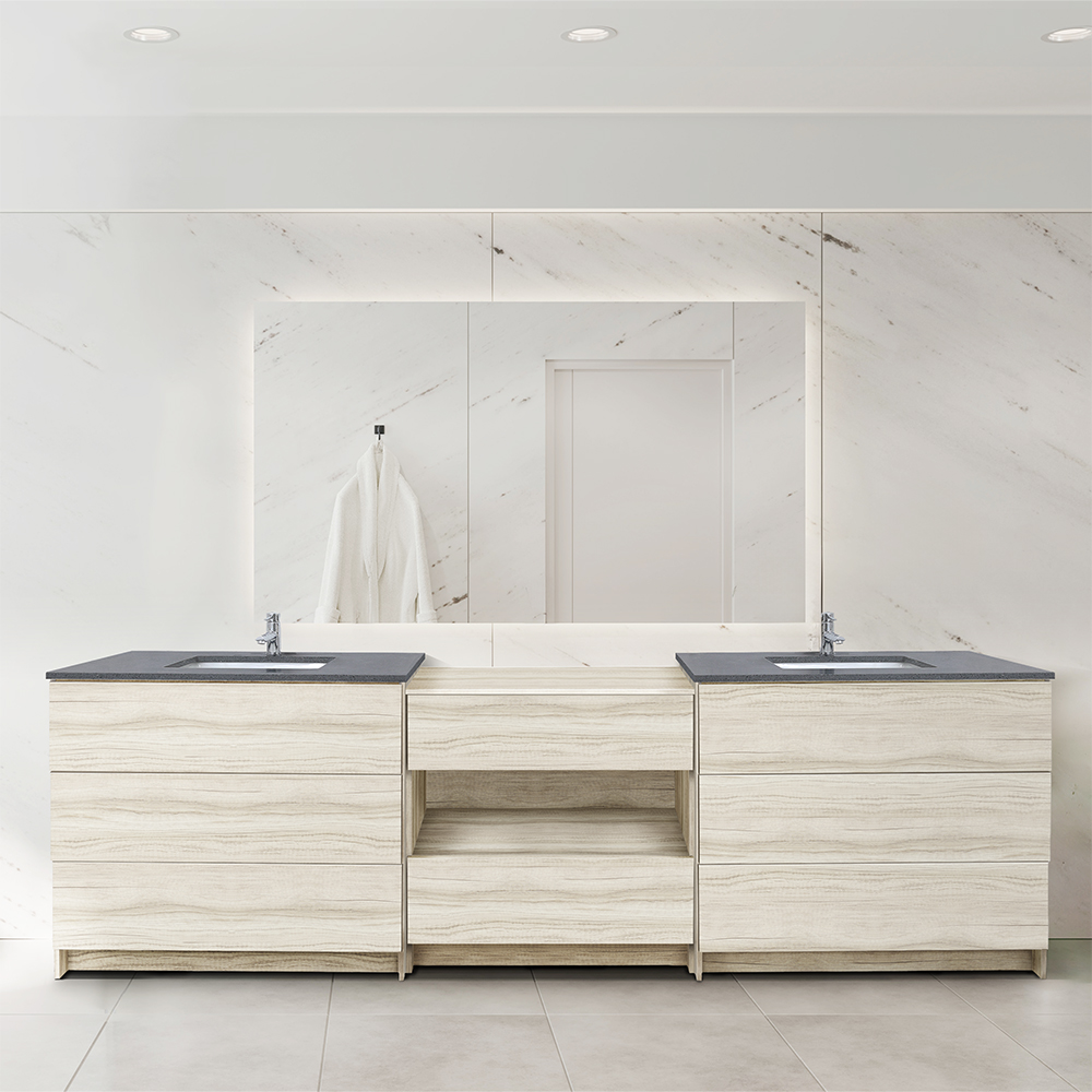 Los elegantes acabados texturizados proporcionan un lujoso complemento a tu cuarto de baño, mezclando ricos tonos de madera con un diseño moderno para conseguir un aspecto atemporal.